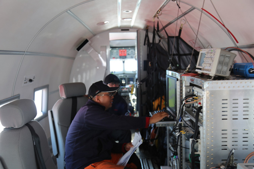 考察队员在机舱内处理探测数据          吴琼 摄