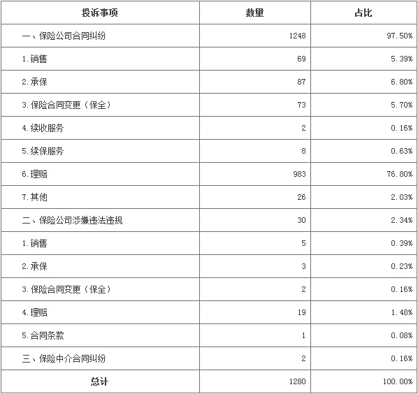 消费者有效投诉涉及财产险的共有1280件。其中,保险公司合同纠纷类投诉1248件,涉嫌违法违规类投诉30件;保险中介机构合同纠纷类投诉2件。财产险涉及保险公司合同纠纷类的投诉中,理赔纠纷983件,占合同纠纷投诉总量的78.77%,纠纷的焦点集中在理赔金额争议、损失核定争议、理赔时效过长等方面。承保纠纷87件,占合同纠纷投诉总量的6.97%,主要反映出险记录导致保费上浮、保单或发票不能及时送达等问题。保全纠纷73件,占合同纠纷投诉总量的5.85%,主要反映退保时间长、对退保金额不满等问题。