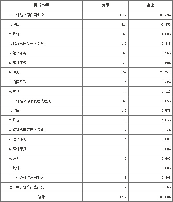 消费者有效投诉涉及人身险的共有1249件。其中,保险公司合同纠纷类投诉1079件,涉嫌违法违规类投诉163件;保险中介机构合同纠纷类投诉5件,涉嫌违法违规类投诉2件。人身险涉及保险公司合同纠纷类的投诉中,销售纠纷424件,占合同纠纷投诉总量的39.30%,主要反映夸大保险责任或收益、营销扰民等问题。理赔纠纷359件,占比33.27%,主要涉及理赔拒赔认定争议、赔付时效争议、理赔金额争议等。保全纠纷130件,占比12.05%,主要涉及普通寿险、分红险及万能险的退保金额争议和退保时效争议等。